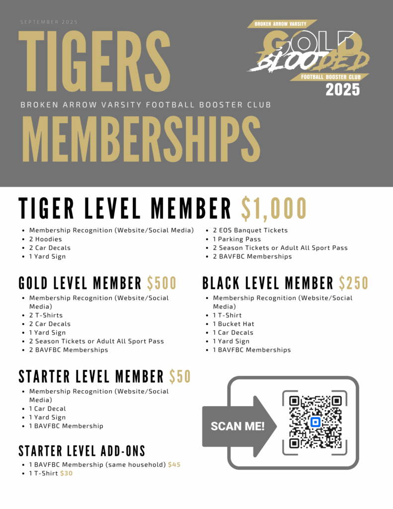 The Broken Arrow Football Booster Club is a parent-led organization dedicated to supporting our players, coaches, and program. We help fund team meals, equipment, travel expenses, and special events throughout the season. Our goal is to create a positive, high-energy environment where student-athletes can grow and succeed both on and off the field. When you join the Booster Club, you’re not just supporting football—you’re investing in the future of Broken Arrow’s youth.
